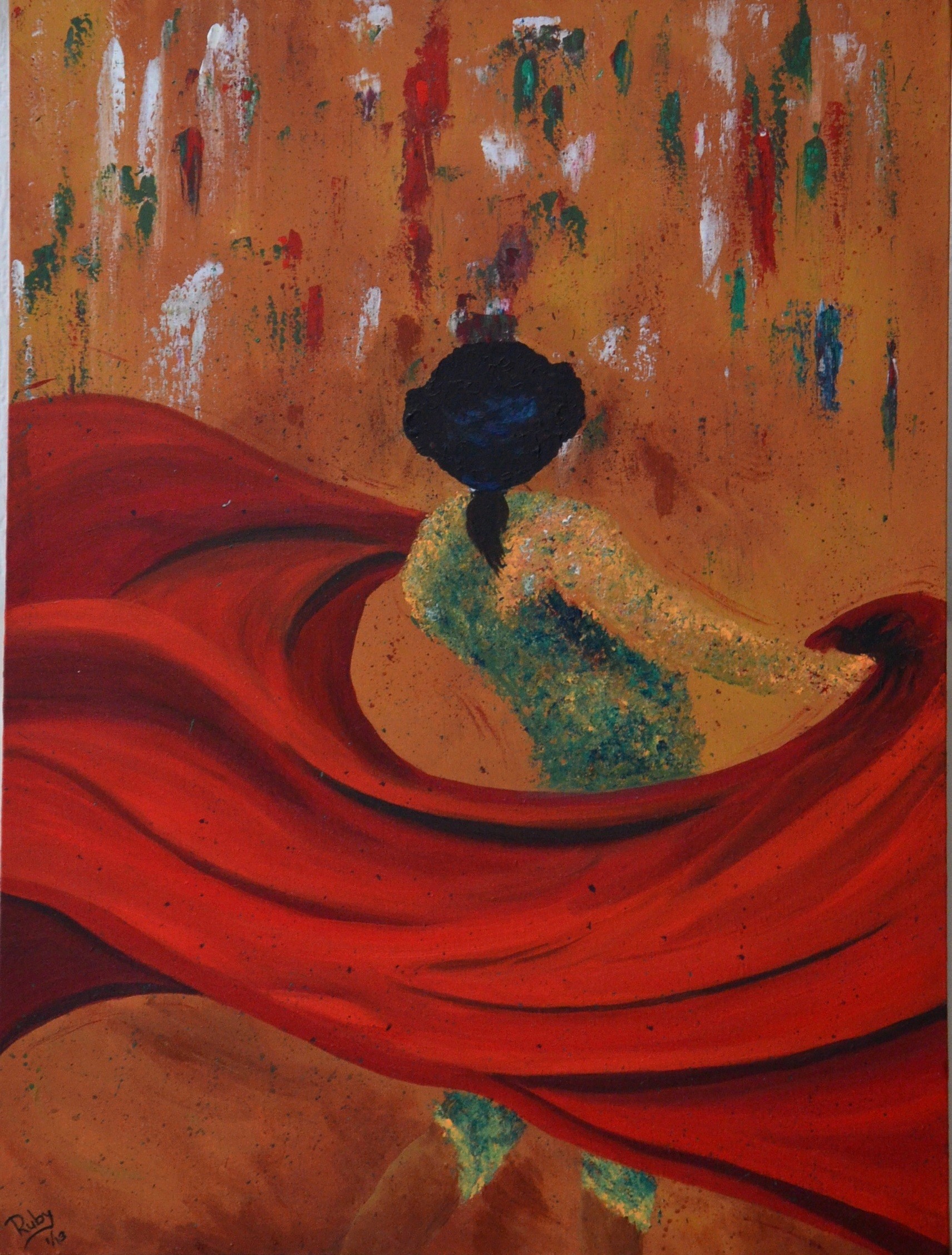 Dit is geen stierengevecht. Er is geen stier en er is geen doden. Ik had het idee om een rood wapperend kleed te schilderen met prachtige plooien. Ik heb er maar een torero achter verzonnen om het doek zinvol te laten zijn. Ik stel voor dat het een danser is die een matador uitbeeldt. Het gaat om trots, grandeur, imponeren, traditie.