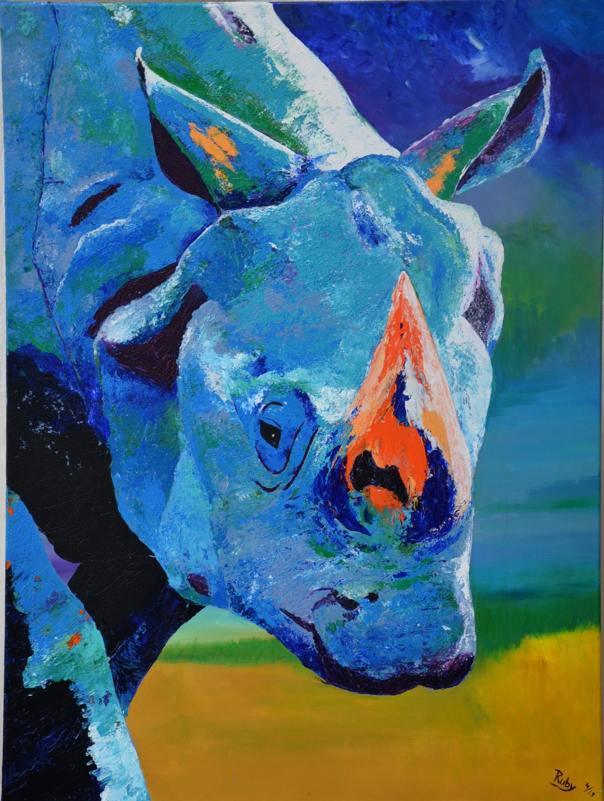 Raffie, de trotse giraf. Opdracht om een giraf in landscape te schilderen, met boom en in kleuren blauw en geel. Het vergt wat studie van de anatomie van dit malle beest voordat hij definitief op het doek stond.