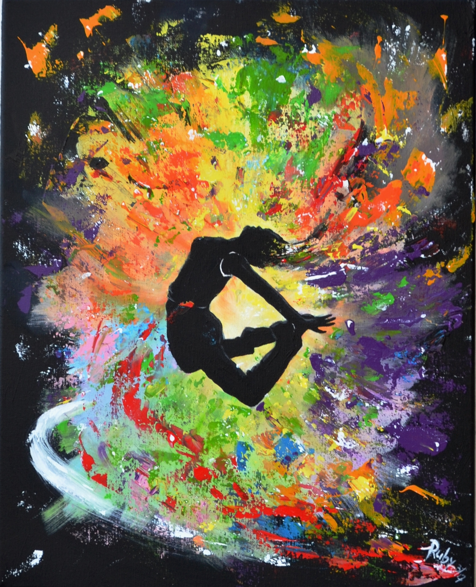 Een vlek die ik gezien had, heb ik vertaald naar een break dancer die in de lucht springt. De danser spat zowat van het doek af.