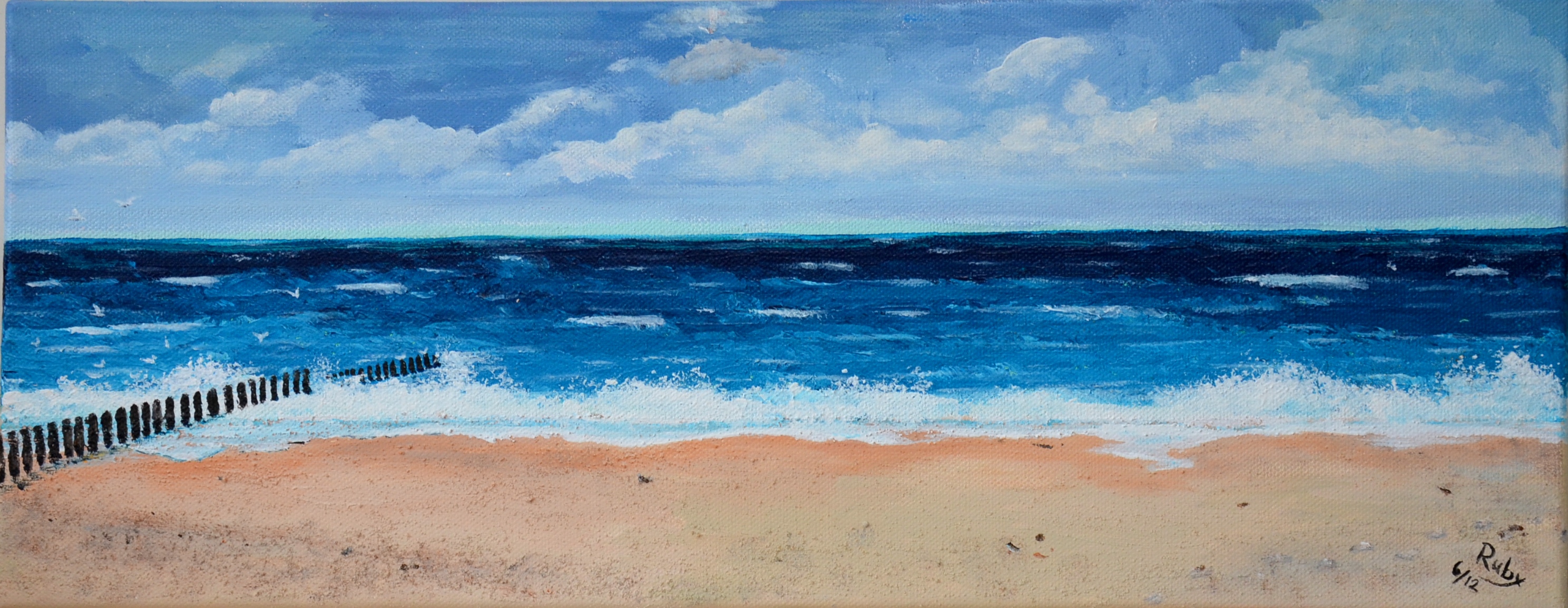 Op locatie in Zeeland de Noordzee geschilderd. De lucht is zoals deze op dat moment was, maar die grijze zee van ons heb ik wat kleurrijker gemaakt, alsof we ons aan de Middellandse Zee wanen. Dat is de vrijheid van de schilder.